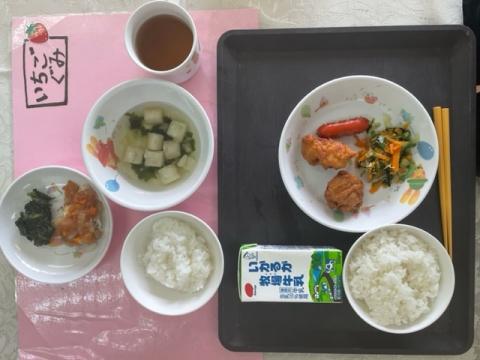 今日の給食: 7月 8日 本日のお給食ごはん鳥のから揚げ赤ウインナーほうれん草の胡麻和え牛乳年長さんは尼崎スイミングスクールへ行っています。尼崎スイミングの大きなプールが大好きなようですごくうれしそうに出かけて行きました。年少さんは園庭で水遊びとプールをしています。ホースで水浴びをしていますがとても楽しそうな声が聞こえてきます。 次へ 今日の給食 前へ